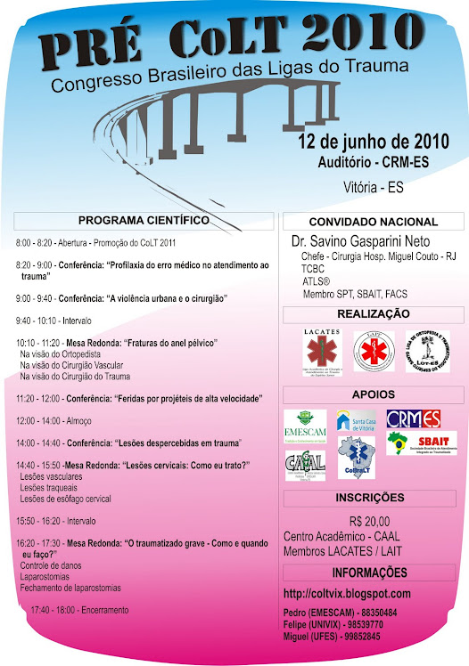 9:40 - 10:10 - Intervalo 10:10 - 11:20 - Mesa Redonda: Fraturas do anel pélvico 10:10 – 10:25 - Na visão do Ortopedista - Dr. Nelson Elias (RJ/ES) 10:25 – 10:40 - Na visão do Cirurgião Vascular - Dr. Frederico Christo Torezani (ES) 10:40 – 10:55 - Na visão do Cirurgião de Trauma - Dr. Fernando Bermudes (ES) 10:55 – 11:20 - Discussão